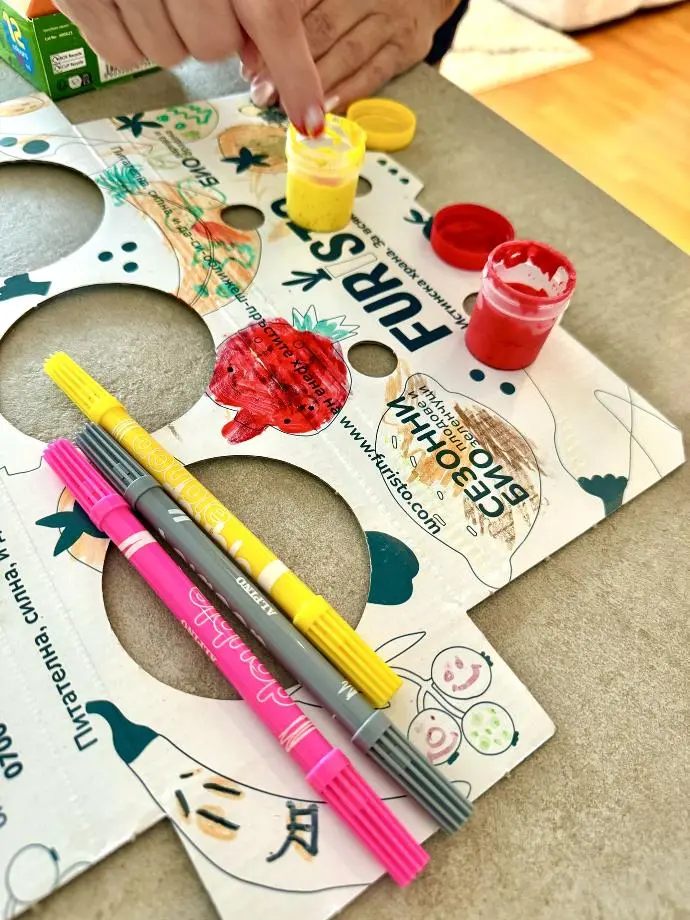 Хартията, която използваме за опаковките, е гланцирана и е трудна (дори невъзможна) за оцветяване с моливи. Препоръчваме ви да използвате флумастри или водни бои.